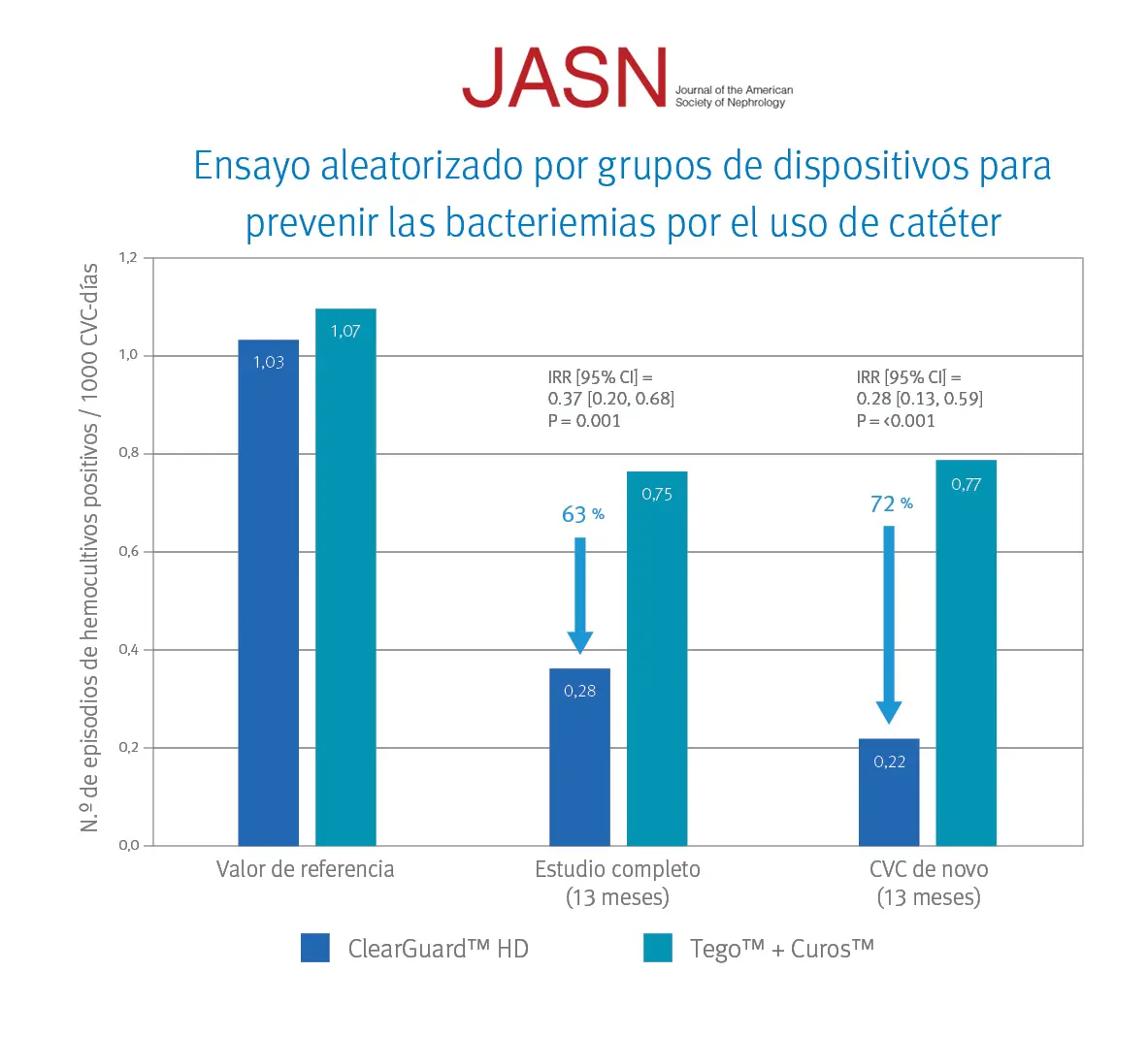 Al considerar el subgrupo de novo (CVC nuevos), el uso de tapones ClearGuard HD se asoció a una tasa de ITS un 72 % menor.