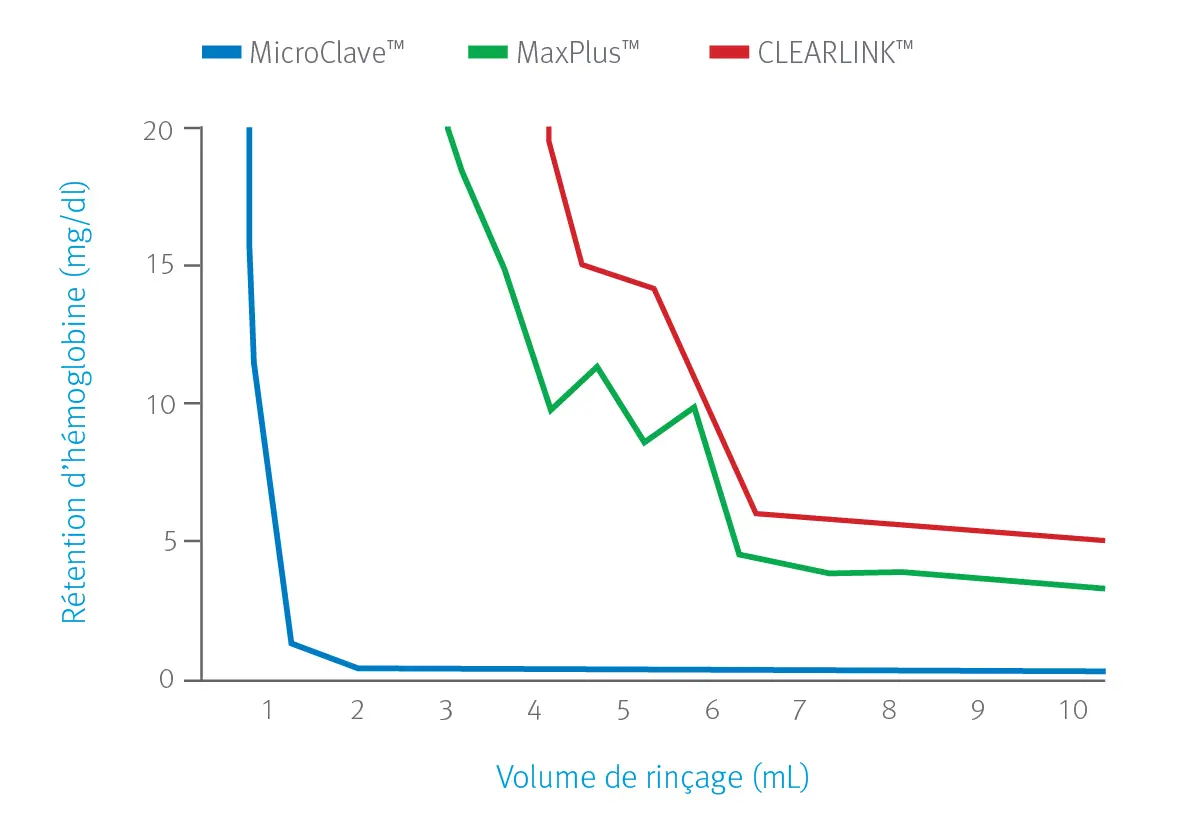 La technologie Clave d’ICU Medical dépasse les performances des connecteurs BD MaxPlus™ et Baxter Clearlink™ qui sont déterminées par le volume de purge total nécessaire pour éliminer les composants sanguins résiduels des connecteurs.7