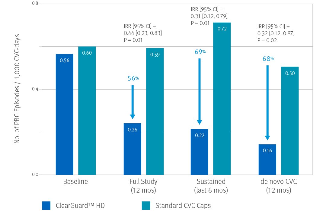 Results: Use of the ClearGuard HD caps for 12 months was associated with a 56% lower BSI rate vs. use of standard caps. When considering sustained use (defined as 6 months of the study), the intervention vs. control was associated with a 69% lower BSI rate.