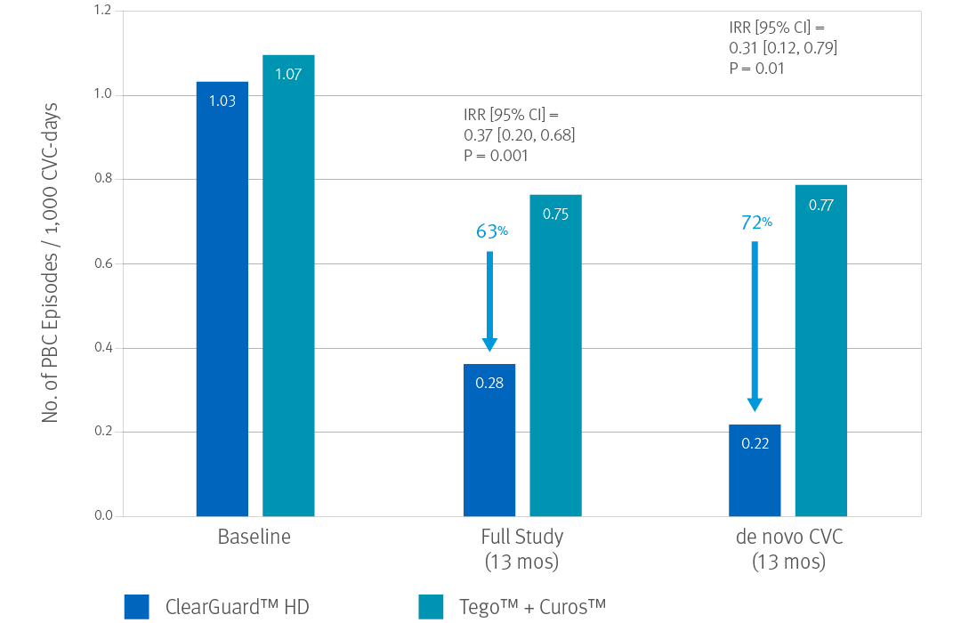 When considering the de novo subgroup (new CVCs), use of ClearGuard HD caps was associated with a 72% lower BSI rate.