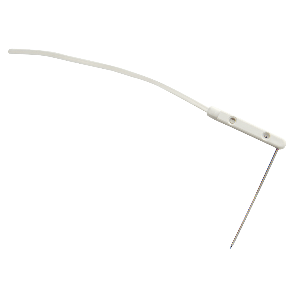 The Level 1 Myocardial Temperature Sensor utilizes a “400” series thermistor that is placed at the tip of a 22 gauge thin wall needle. The needle is formed at a right angle to a molded plastic hub to assure better fixation with a low profile. The sensor’s lead wires are terminated by an electrical connector that facilitates interconnection with the temperature monitoring system. The lead wires are 1.8 meters (6 feet) long. The needle is electrically insulated from the lead wires. The temperature sensor is in the form of an electrically insulated “400” series thermistor.